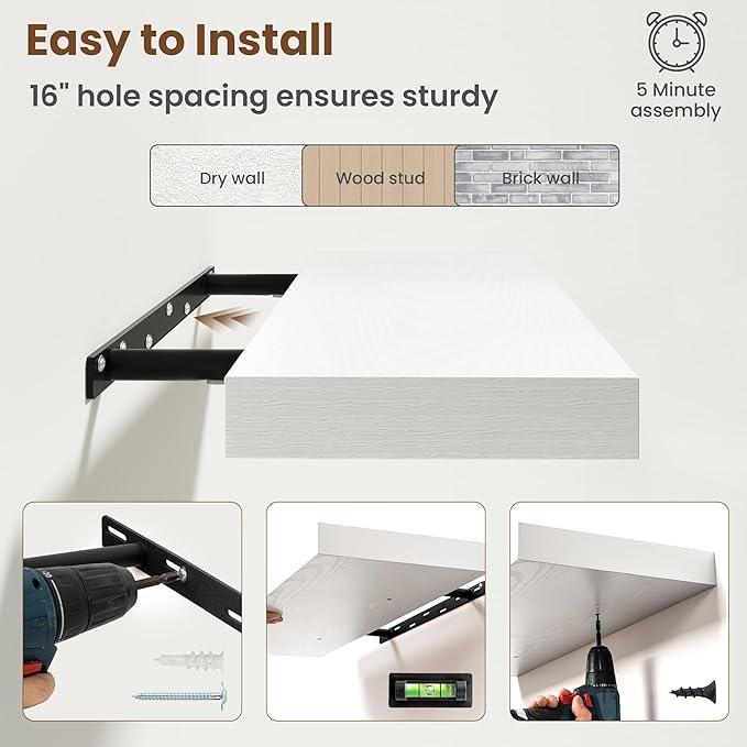 - Easy & Secure Installation: The wooden floating shelves with stainless-steel invisible brackets, screws, anchors, and a magnetic level, installation is simple and quick. Follow the included instructions to mount securely in under 5 minutes.
