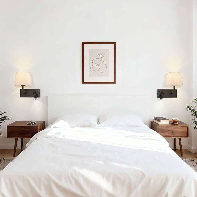 - FEATURE: Hardwire wall lamp features a rectangular backplate and a sleek dark bronze body with a beige fabric shade for a timeless, modern look—perfect for headboards, reading corners, hallways, and guest rooms. Bedside wall lights consists of fabric wall sconce and adjustable LED reading light that controlled by individual on/off rocker switch. Headboard wall mount lamp with Type A+C USB port for fast and convenient charging of phones, tablets, and other electronics.
