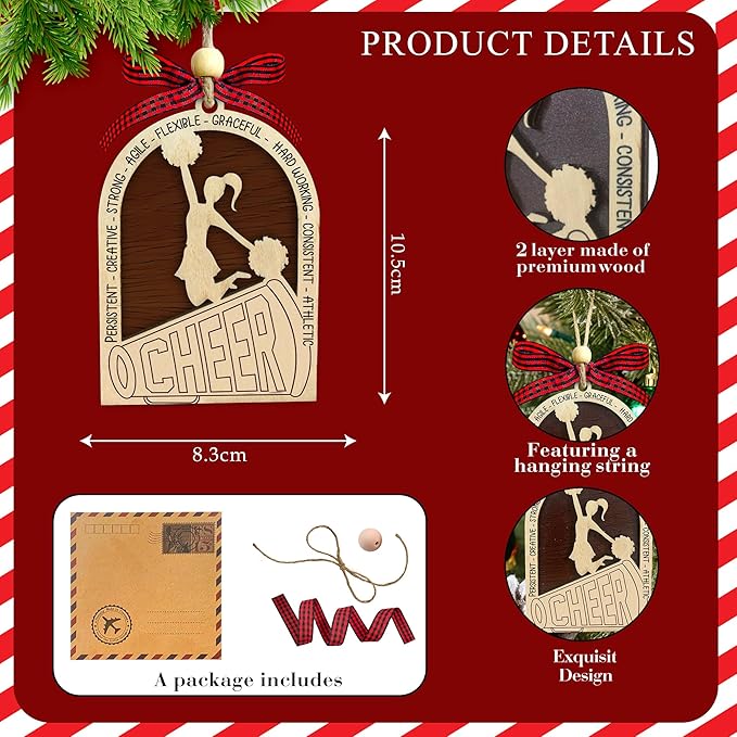 - Eco-Friendly Cheer Ornament – Crafted from 2 layers of sustainable wood, this cheerleading ornament measures 4.1 × 2.8 inches with a total thickness of 6mm, ensuring durability and lightweight charm. Perfect for cheerleaders, athletes, coaches, and supportive parents, it celebrates being persistent, creative, strong, agile, flexible, graceful, hard working, consistent, and athletic. A meaningful Christmas decoration or year-round keepsake for those who love cheer