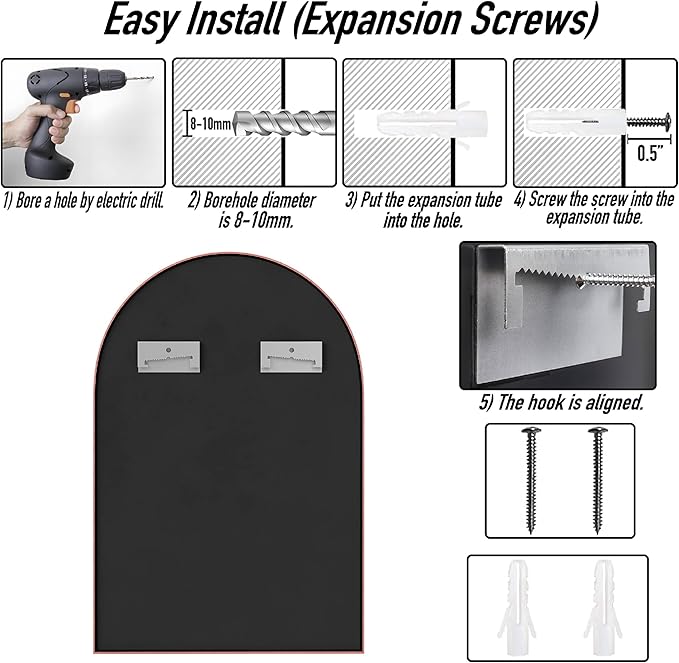 - Easy to Install: Installation instructions and tools are in the package, install the expansion screws on the wall(Required Electric Drill), and then hang the mirror on the screws.