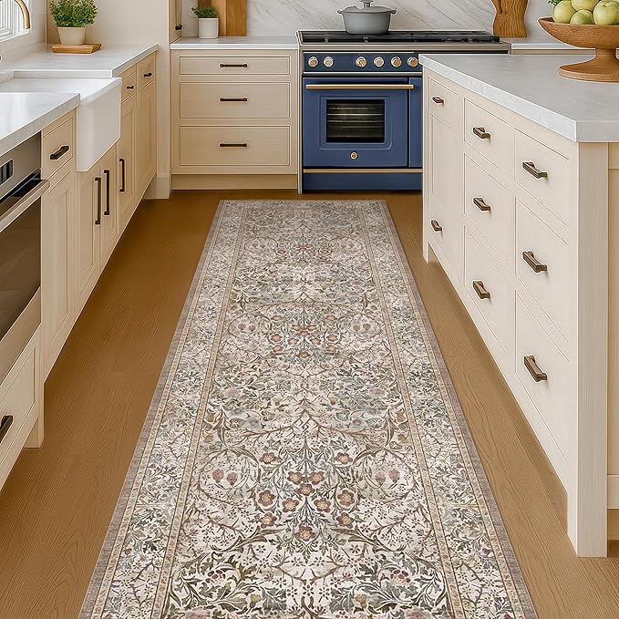 Moss Green 2'6" x 10' Long Runners for Hallways Non Slip, Vintage Washable Rugs for Kitchen, Entryway Stain Resistant with Rubber Backing - Vintage Taupe Brown Floral Décor