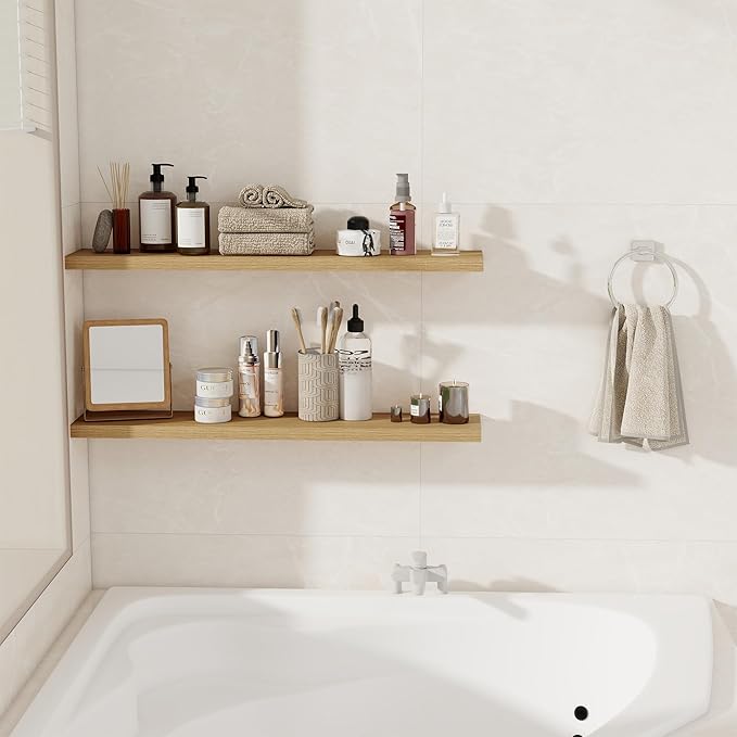 Fun Memories Floating Shelves for Wall, 36" Rustic Wood Deep Wall Mounted Shelves with Invisible Brackets for Decor & Storage, Floating Shelf for Living Room, Bathroom (Oak, Set of 2)