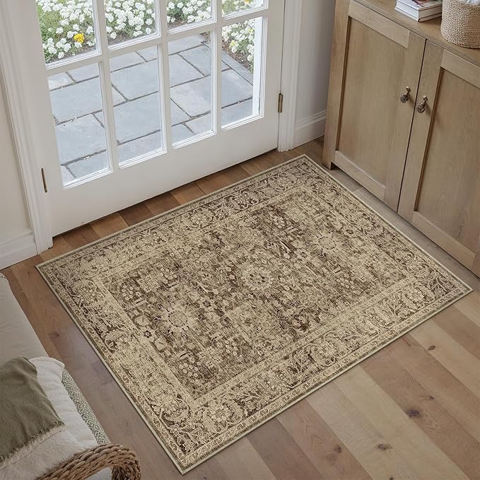 Brown 2x3 Entryway Area Rug Machine Washable Doormat Kitchen Vintage Distressed Non Slip Carpet Indoor Traditional Floral Accent Throw Small Rug for Bathroom Office Bedroom Living Dining Room