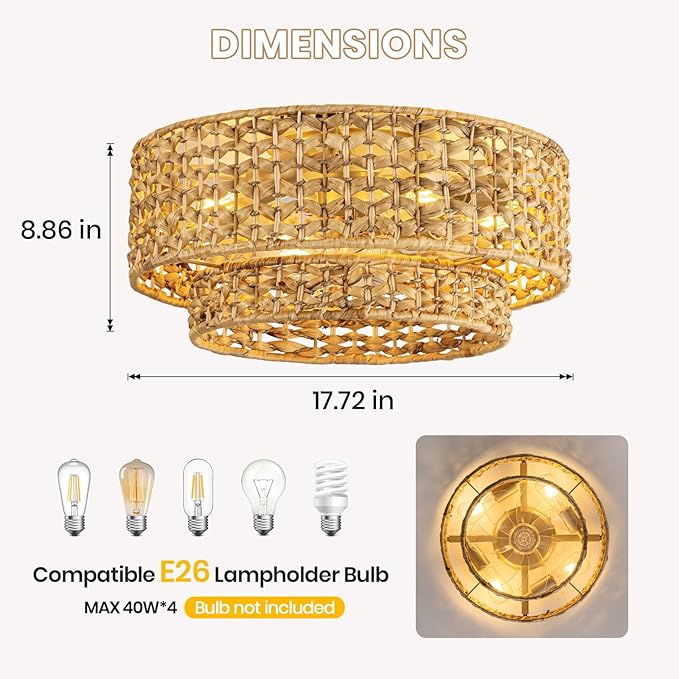 - 【E26 Bulbs Light】Our layered rattan boho caged ceiling fan with light 17.7" rattan is a versatile and functional addition to any room. With 4 E26 bulb light sources, it provides ample lighting for different occasions. It can compatibility with LED, CFL, or incandescent bulbs (Bulb not included) allows you to choose the type of bulbs that best suit your needs.