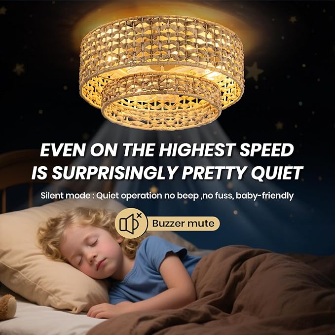 - 【Ultra-Quiet Comfort for Peaceful Nights】Enjoy restful sleep and whisper-quiet airflow with this boho ceiling fan with light. Featuring 7 ultra-silent ABS blades operating below 35dB, this quiet rattan ceiling fan provides gentle, soothing circulation without disturbing your rest. The warm light and calm breeze make it the ideal bedroom ceiling fan with lights for light sleepers, nurseries, or anyone who values peace and relaxation in their home