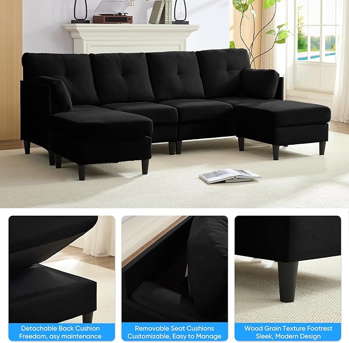PUREMIND Sectional Couches for Living Room, Modern Snow Velvet U-Shaped Sofa Couch with Double Chaise, Upholstered 4 Seater Home Sofa for Living Room, Apartment, Office, Black