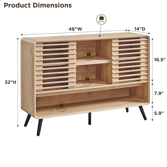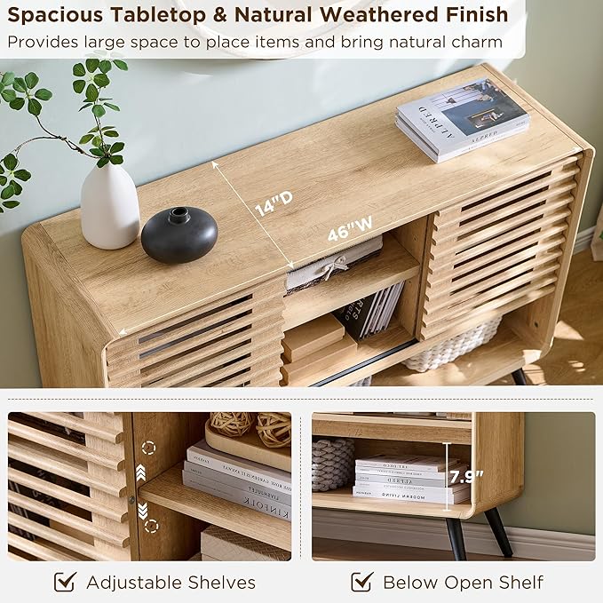 - 【Versatile & Smart Storage】With a 46" wide top and sliding-door cabinets, this table offers plenty of room to display and store items like books, media, and decor. Adjustable shelves and an open lower shelf (11" tall) keep everything organized and within easy reach.