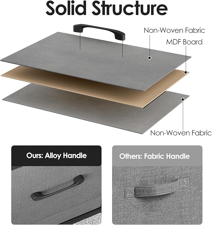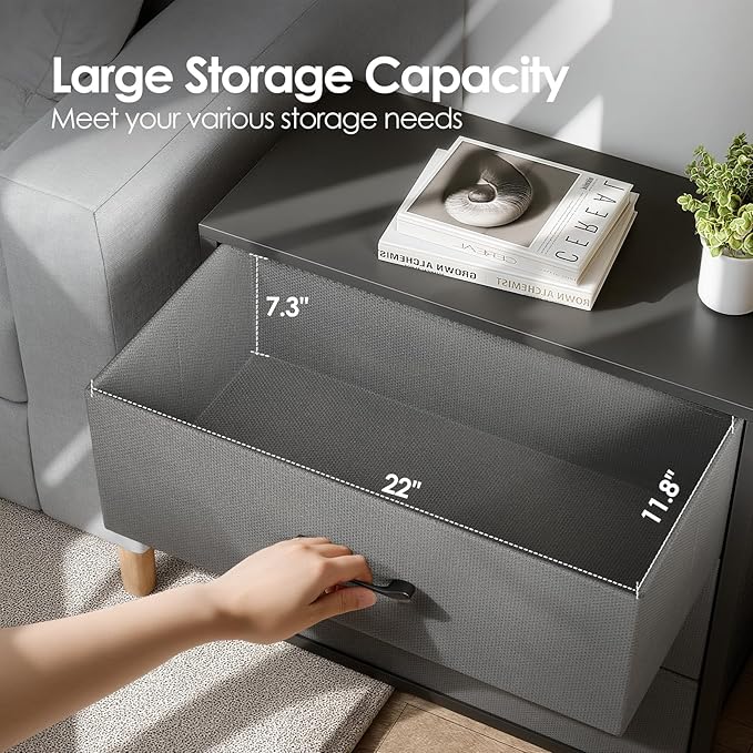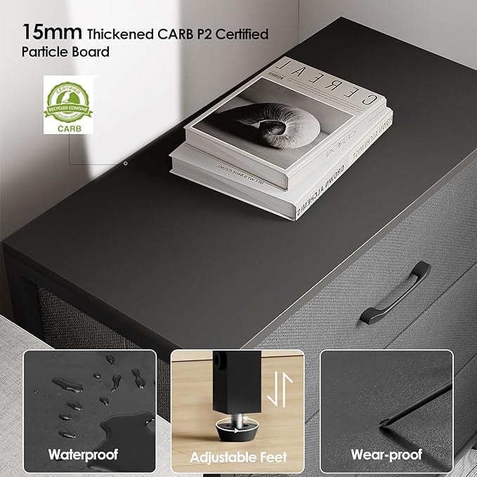 - 【Fabric Dresser with 3 Storage Drawer】Keep clutter away by storing items in categories for storage in these 3 wider drawers; The waterproof & wear-resistant wooden top provides hard space for a desk lamp, alarm clock, and daily essentials within reach; Combine efficient storage function with classic flair, the small bedroom dresser is perfect for small spaces bedroom, put this fabric dresser near a bed or sofa to use it as a nightstand or an end table, ideal for bedrooms, living rooms, closets.