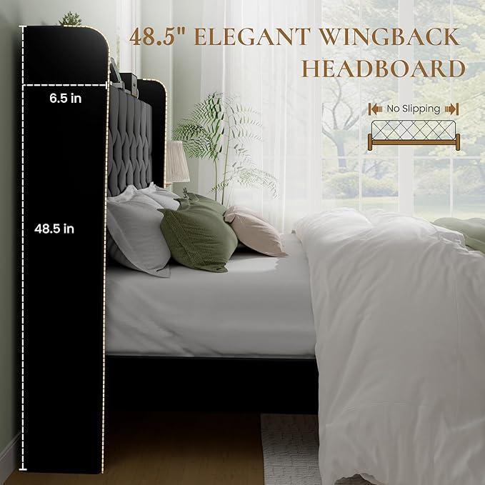 • Velvet & Wingback Design: This full bed frame, featuring velvet upholstery and a wingback headboard, combines elegance and support. The recessed edges prevent mattress shifting, ensuring both stability and style