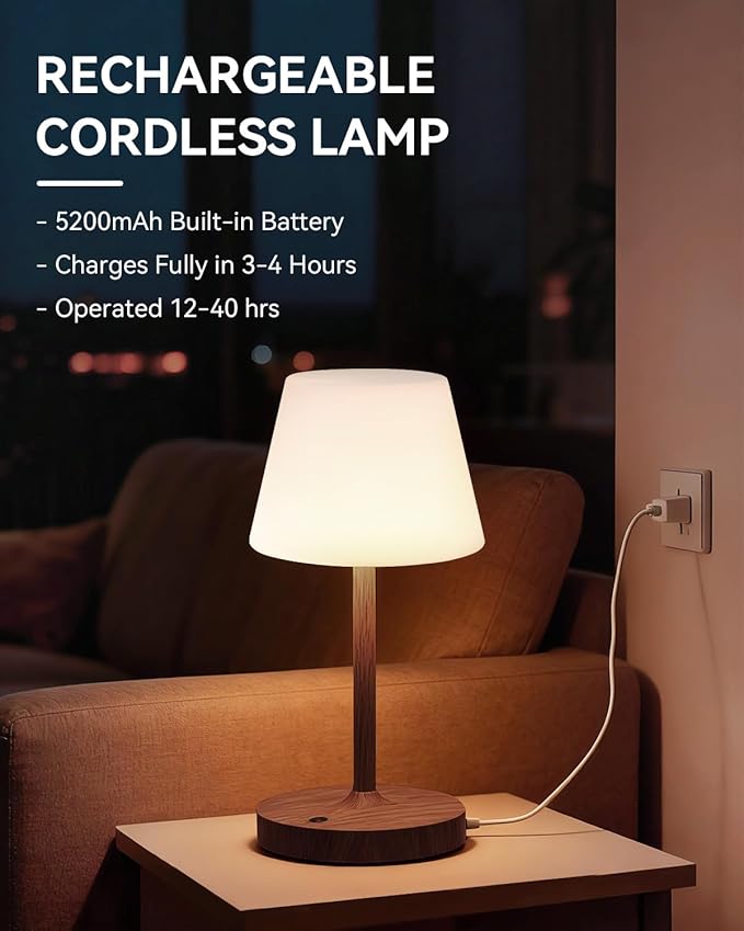 - 🔋 5200mAh Long-Lasting Battery & Fast Recharge: Powered by a reliable 5200mAh Li-ion battery, this lamp delivers exceptional runtime—over 12 hours at the highest brightness and up to 40 hours in dim mode on one charge. Recharge fully in just 3–4 hours using the included USB/Type-C cables (5V/3A input). Spend less time charging and more time enjoying bright, dependable light, backed by an upgraded LED that lasts up to 30,000 hours.