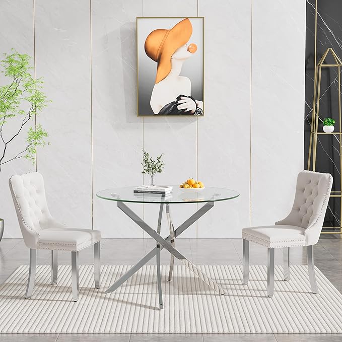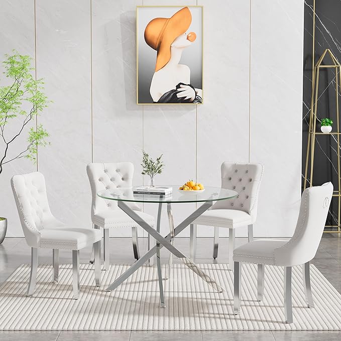 36" Round Glass Dining Room Table for 4 with Tempered Glass Top and Silver Chrome Metal Legs, Modern Clear Kitchen and Dinner Table for Home Office Dining Room