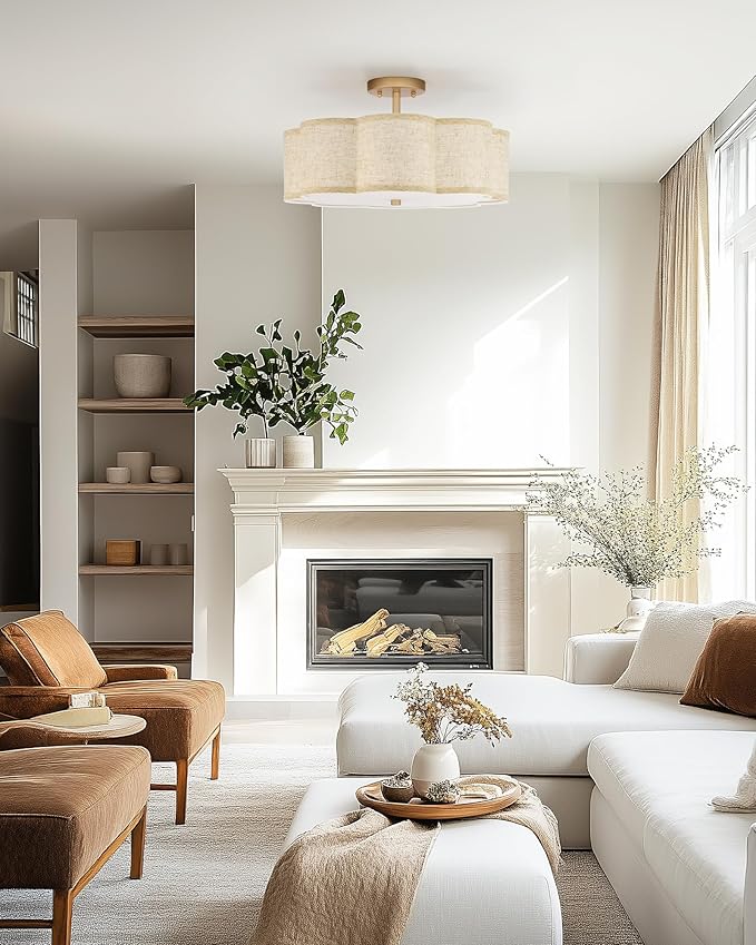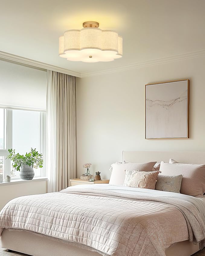 - Farmhouse Style: Elevate your space with the rustic elegance of our farmhouse semi flush mount ceiling light. Featuring beige linen fabric drum shade in petal-shaped and gold finish, it exudes a minimalist vintage vibe, adding character to any room