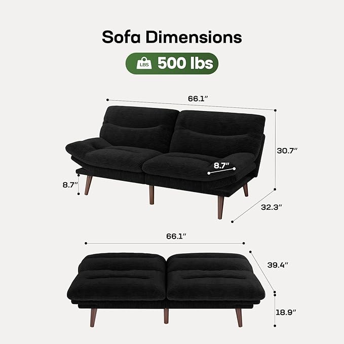 - Convertible Futon Sofa Bed: This 2-in-1 sofa bed couch transitions from a stylish futon couch to a comfortable convertible sleeper sofa. With dimensions of 66.1″ W x 32.3″ D x 30.7″ H, small sofa size, this futon bed is the perfect space-saving solution for compact apartments, studios, or guest rooms to maximize functionality without sacrificing comfort.