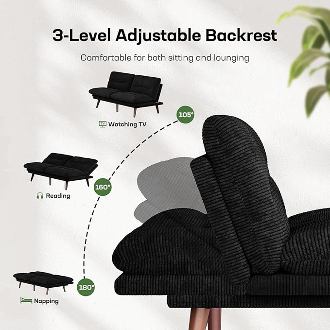 Marsail Futon Sofa Bed, Futon Couch with Adjustable Backrest & Armrests, Convertible Small Sleeper Sofa Bed for Small Apartments, Study Room, Office, Corduroy Loveseat, Black