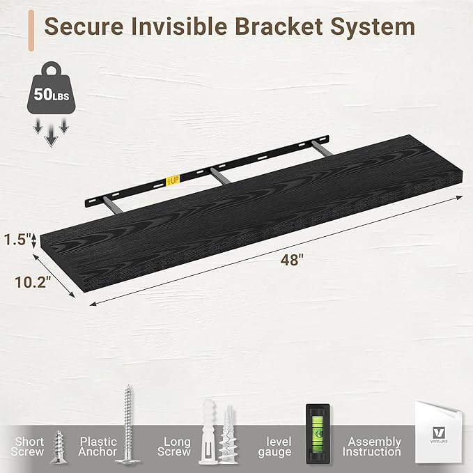 Vivelove 48 Inches Floating Shelves Wall Mounted, 10" Deep Wall Shelves for Bedroom, Bathroom, Living Room, Kitchen, Office, Home Decor, Modern Shelf, Set of 2, Black, 48x10.2x1.5