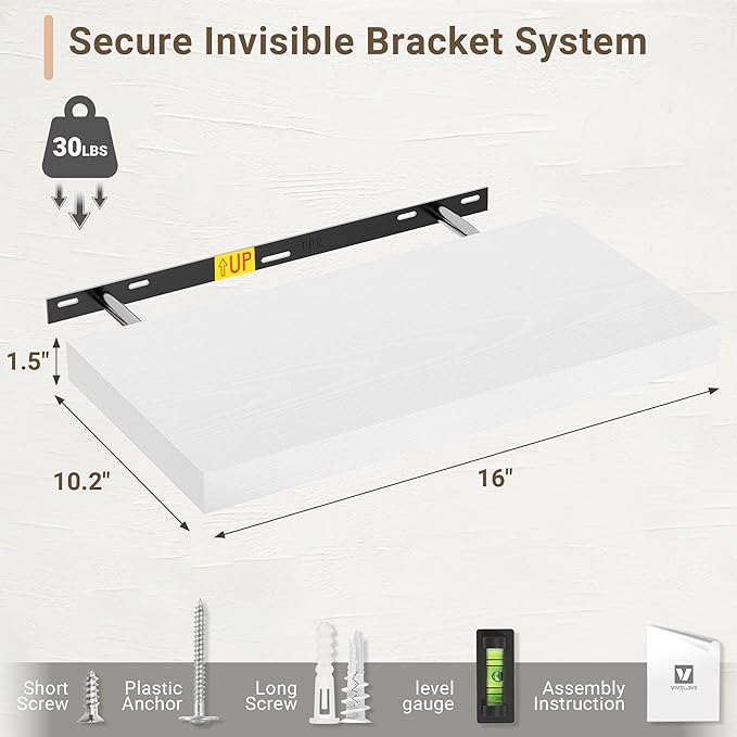 - 【Invisible Bracket for Clean Look】The hidden bracket system creates a seamless “floating” effect—no visible hardware! just clean lines that make your bedroom photos, laundry room essentials, or bathroom displays the star of any room.