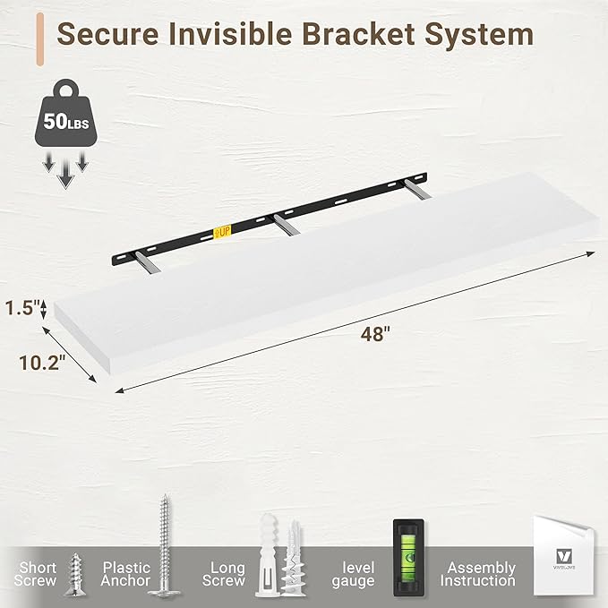 Vivelove 10 in Deep Floating Shelves for Wall, 48" x 10.2" x 1.5" Shelves for Room Wall Mounted, 1.5 Inch Thick Shelf for Bathroom Bedroom Kitchen Book Room, Modern Farmhouse Decor, Set of 2, White