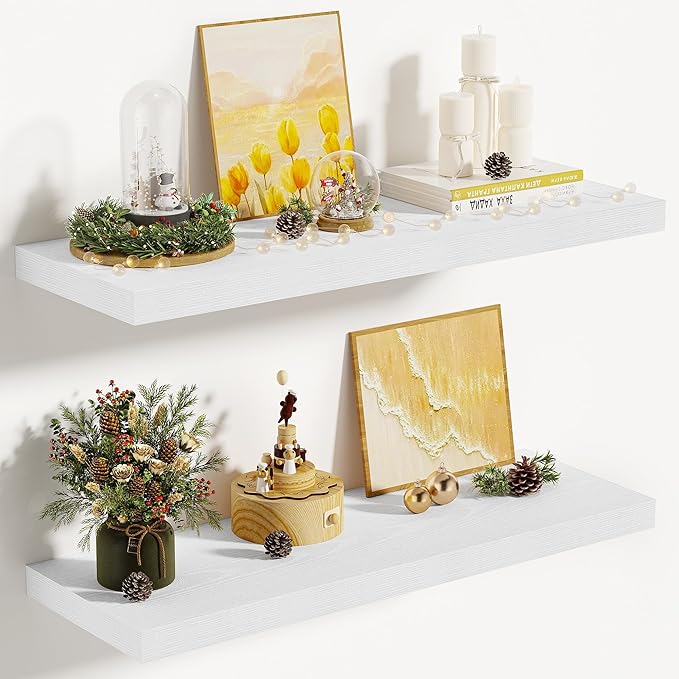 Vivelove 10 in Deep Floating Shelves for Wall, 24" x 10.2" x 1.5" Shelves for Room Wall Mounted, 1.5 Inch Thick Shelf for Bathroom Bedroom Kitchen Book Room, Modern Farmhouse Decor, Set of 2, White