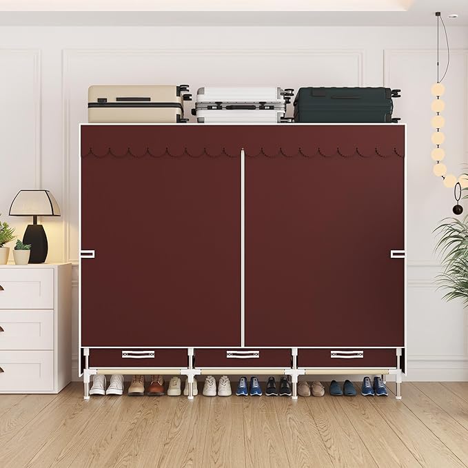 - 【Multifunctional Storage Solutions】: This Multifunctional portable wardrobe features 3 spacious lockers and 3 convenient drawers, perfect for organizing clothes, scarves, pants, jewelry, socks, towels. Besides 3 dedicated hanging areas for long skirts, dresses, and suits, The top section accommodates suitcases and large storage boxes, while the bottom is perfect for shoes. Effortlessly load and unload your items for effortless organization!