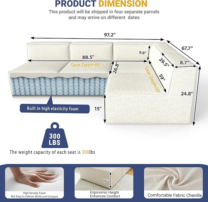 97" Sectional Compressed Sofa Modular Couches,High-Density Foam No Assembly Required,3-Piece(1xCorner 3xArmless) for Living Room, Chenille Beige White