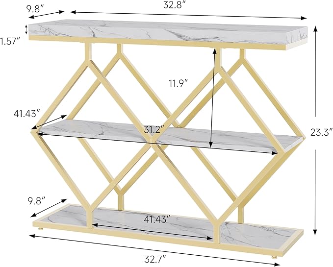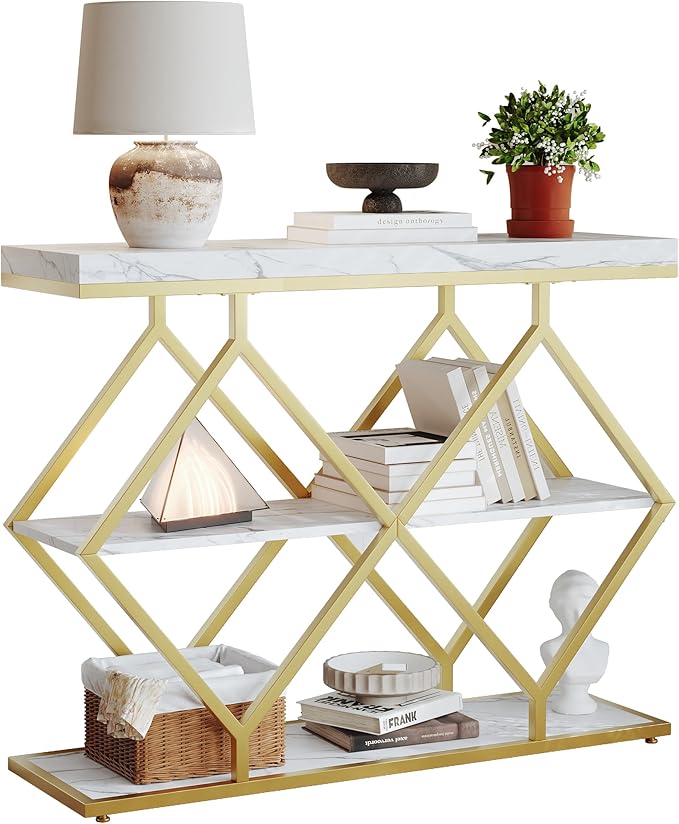 Garvee 3-Tier Entryway Table, Industrial Console Sofa Table with Storage, Accent Table with Open Shelves, Diamond-Shaped Metal Frame, Foyer Table for Entryway, Hallway, White
