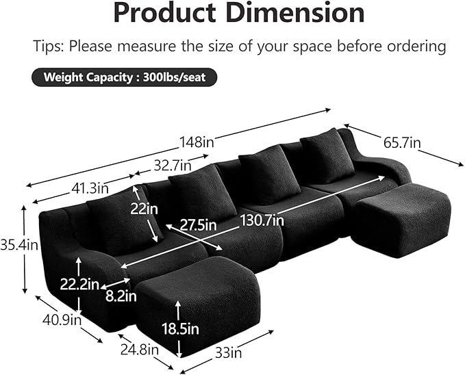 - Product Dimensions : 65.7"D x 148"W x 35.4"H