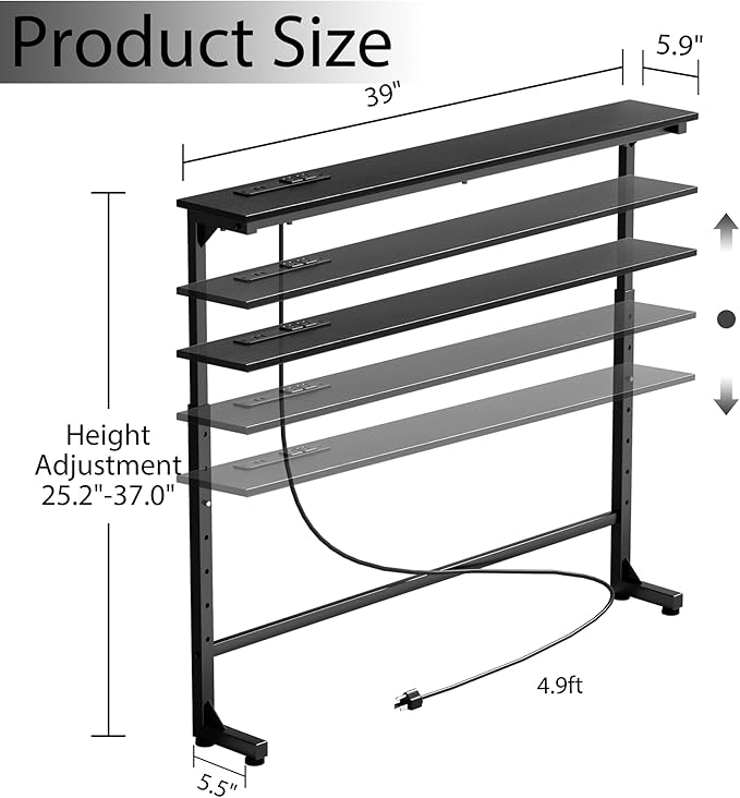 39 inch Narrow Console Table with Outlet,Adjustable Height(25"-37") Behind Sofa Table,Couch Behind Table Skinny,Couch Shelf with Charging Station,Long Entryway Tables for Living Room,Black