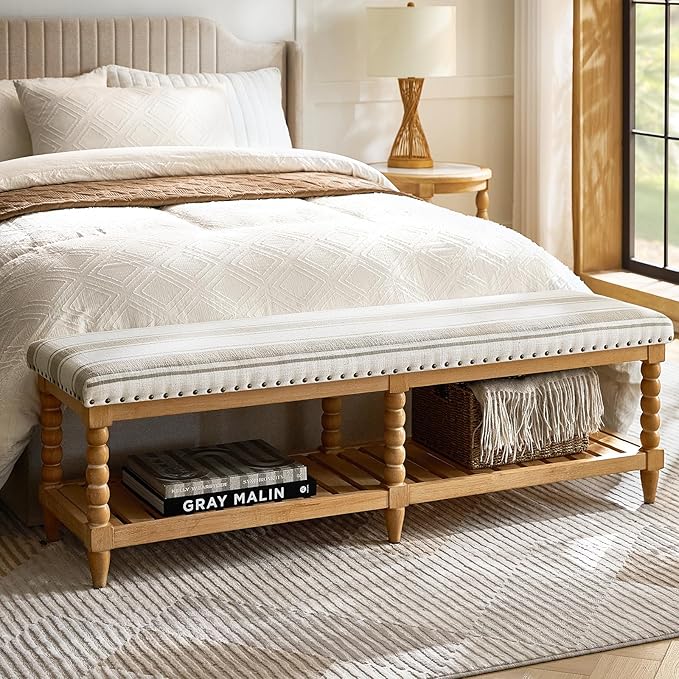 HULALA HOME Farmhouse Entryway Bench, 58" Fabric Bed Bench with Shelf, Solid Spindle Legs, Nailhead Trim Detail for Bedroom, Living Room, Hallway, TAN