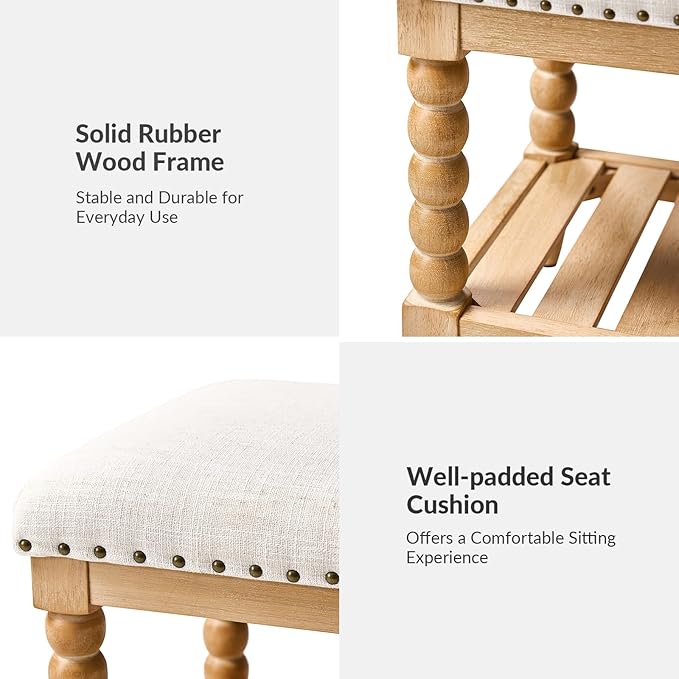 HULALA HOME Farmhouse Entryway Bench, 58" Fabric Bed Bench with Shelf, Solid Spindle Legs, Nailhead Trim Detail for Bedroom, Living Room, Hallway, Ivory