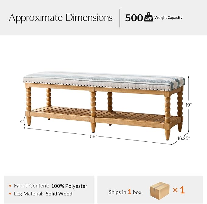 HULALA HOME Entryway Bench with Soild Wood Shelf, 58" Upholstered Shoe Storage Bench with Spindle Legs, Nailhead Trim Detail for Bedroom, Living Room, Hallway, Strip