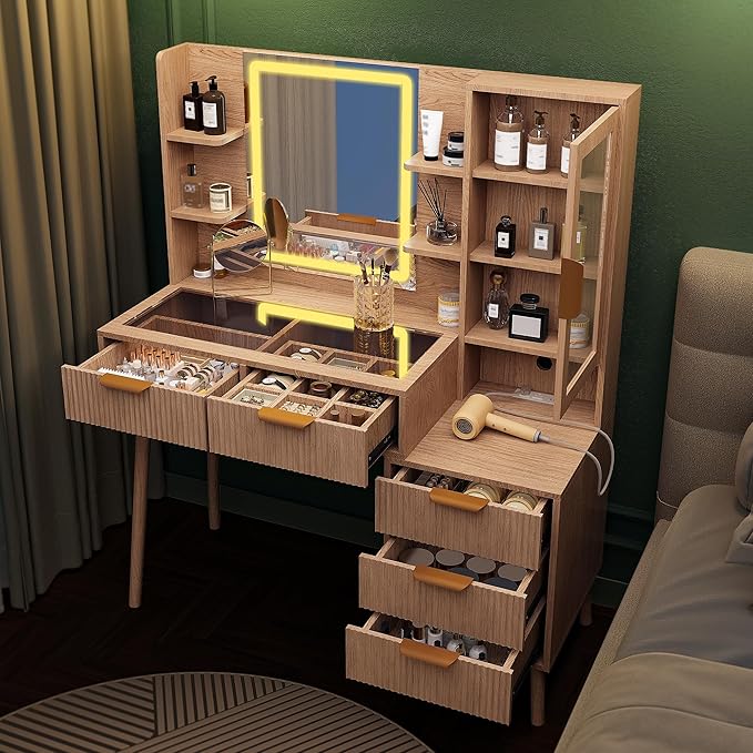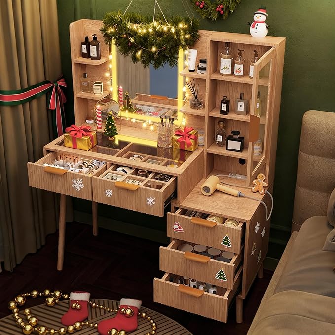 - Vanity Table with Charging Station: Built-in power outlets support hairdryers, straighteners, or chargers. This vanity table allow you to conveniently connect and charge hair tools, smartphones, tablets, and other devices, making this vanity practical for daily use. Also, this vanity organizer is a great gift for birthdays, Valentine's Day, Mother's Day, and Christmas