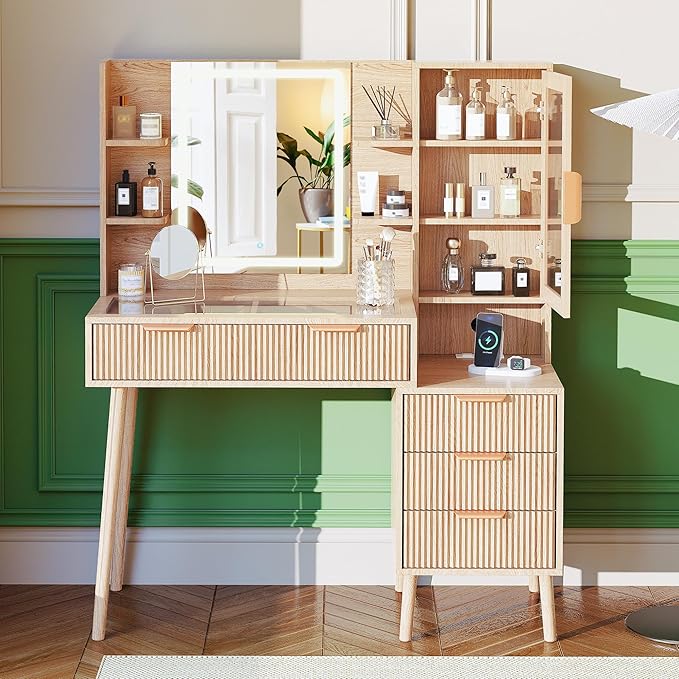 - Makeup Organizer with Visible Drawer: This fluted makeup vanity includes 2 large drawers, 3 storage drawers, 1 storage cabinet, and a spacious tabletop, keeping all your ornaments, cosmetics, skin care products, and other beauty essentials organized and accessible. With the clear glass tabletop, you can easily see and find the things needed inside the drawers a breeze