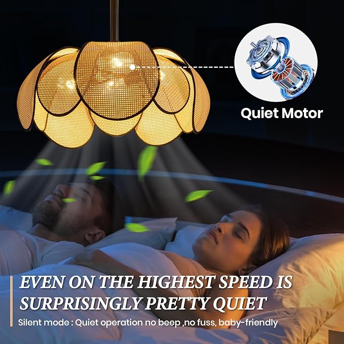 - 【Ultra-Quiet Comfort for Peaceful Nights】Enjoy restful sleep and whisper-quiet airflow with this boho ceiling fan with light. Featuring 7 ultra-silent ABS blades operating below 35dB, this quiet rattan ceiling fan provides gentle, soothing circulation without disturbing your rest. The warm light and calm breeze make it the ideal bedroom ceiling fan with lights for light sleepers, nurseries, or anyone who values peace and relaxation in their home