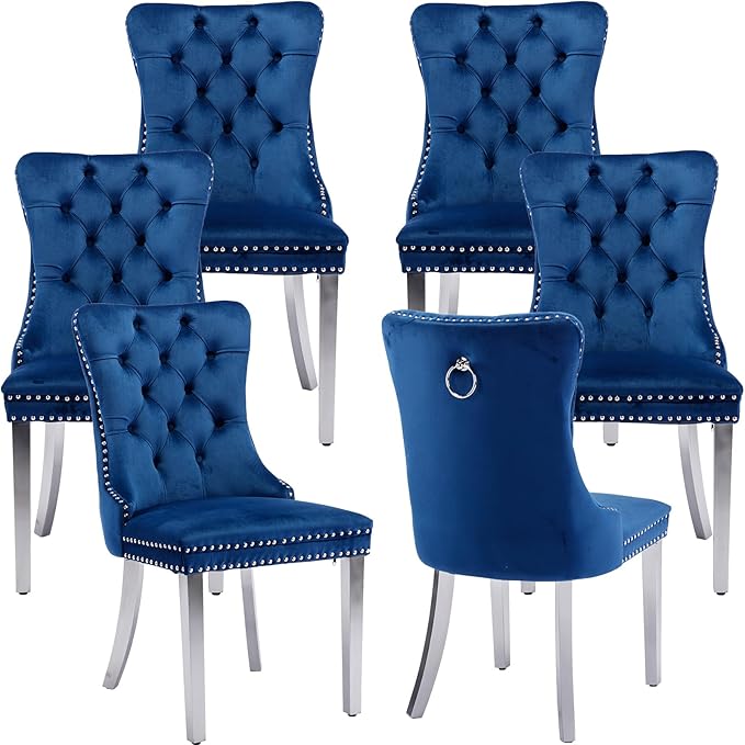 Luxury Upholstered Dining Chairs Set of 6, Blue Kitchen Chair with Silver Metal Legs, Velvet Tufted Back Dining Chair, Sillas de Comedor, Modern Kitchen & Dining Room Chairs (Blue, 6 Pcs)