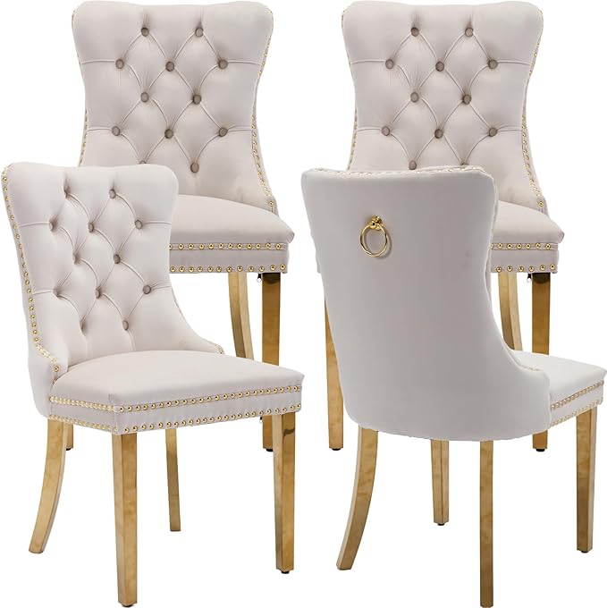 Luxury Upholstered Dining Chairs Set of 4, Beige Kitchen Chair with Golden Metal Legs, Velvet Tufted Back Dining Chair, Sillas de Comedor, Modern Kitchen & Dining Room Chairs (Beige, 4 Pcs)