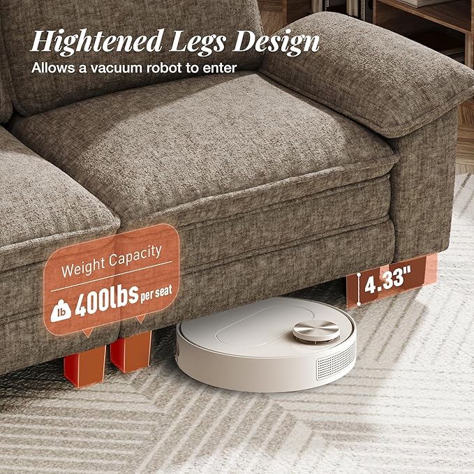- The solid wood frame offers robust support while remaining lightweight for easy moving. The 4.33-inch-tall legs are equipped with scratch-proof, silent feet to protect your floors, and their elevated design allows robot vacuums to clean underneath effortlessly. Wide armrest pillows on both sides provide a comfortable spot to rest your arms, blending support with relaxation