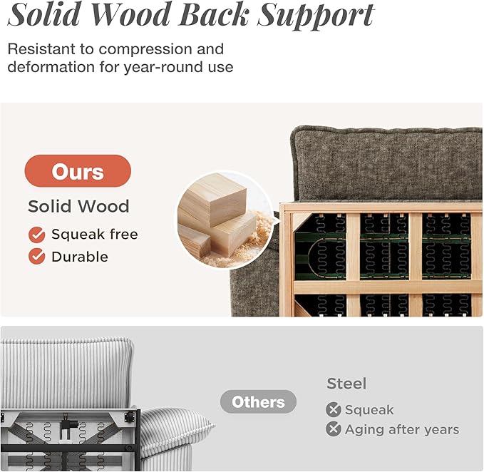 - The solid wood frame offers robust support while remaining lightweight for easy moving. The 4.33-inch-tall legs are equipped with scratch-proof, silent feet to protect your floors, and their elevated design allows robot vacuums to clean underneath effortlessly. Wide armrest pillows on both sides provide a comfortable spot to rest your arms, blending support with relaxation