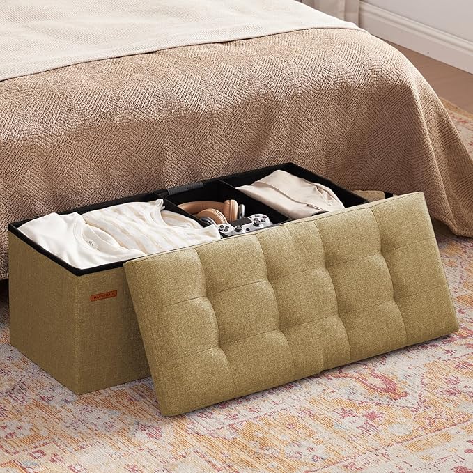 HAUSFRAU 31.5 Inches Ottoman with Storage Bench, Folding Ottoman Bench Small Foot Rest Stool, Bedroom Bench with Flipping Lid, Linen Kaki
