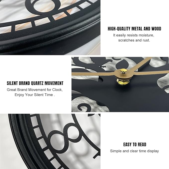 - 【High Quality Durable Large Wall Clock】:This black metal wall clock uses a thickened iron metal frame and a natural solid wood dial, and is crafted with double protection - the frame is treated with anti-rust paint, and the wood grain surface is covered with wear-resistant varnish, which can easily resist moisture, scratches and rust.