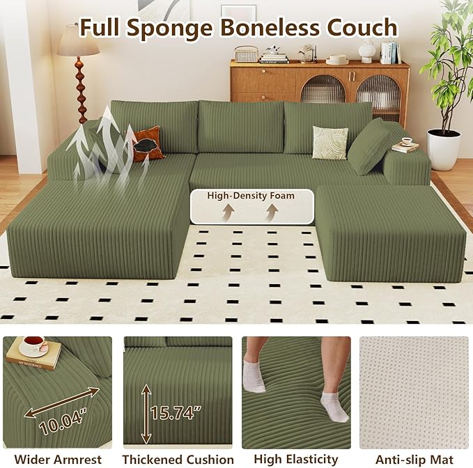 96" U-Shape Cloud Couch, Modern Modular Sectional L-Shape Sofa with Ottoman, Corduroy Upholstered Couches Deep Seat Sleeper Chaise Longue for Living Room, No Assembly Required(Green, Left Facing)