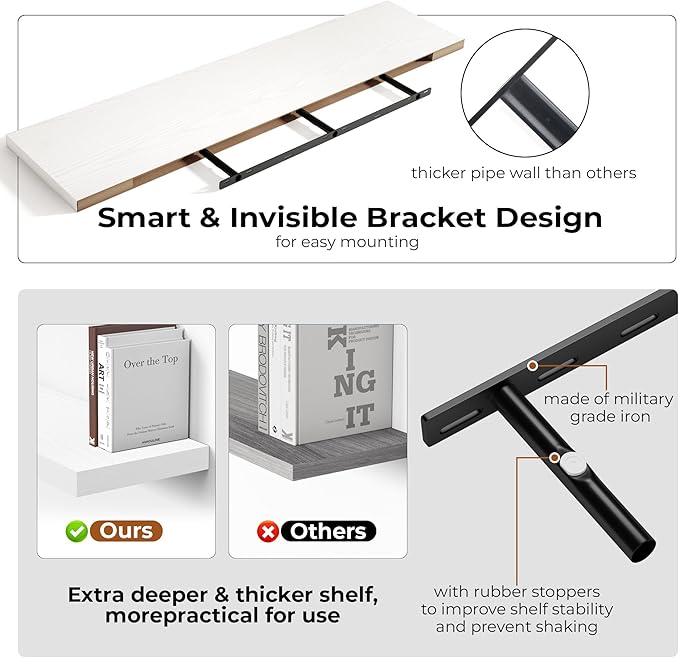 - Easy, Hassle-Free Installation: Get your shelf up in no time! Each set includes all necessary hardware: durable steel invisible brackets, toggle bolts for drywall, and a clear instruction manual. With just a few simple steps, installation is quick and straightforward. Our customer support team is always ready to assist if needed.