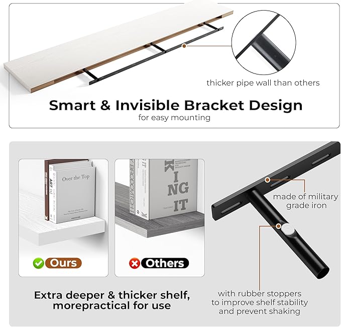 - Easy, Hassle-Free Installation: Get your shelf up in no time! Each set includes all necessary hardware: durable steel invisible brackets, toggle bolts for drywall, and a clear instruction manual. With just a few simple steps, installation is quick and straightforward. Our customer support team is always ready to assist if needed.