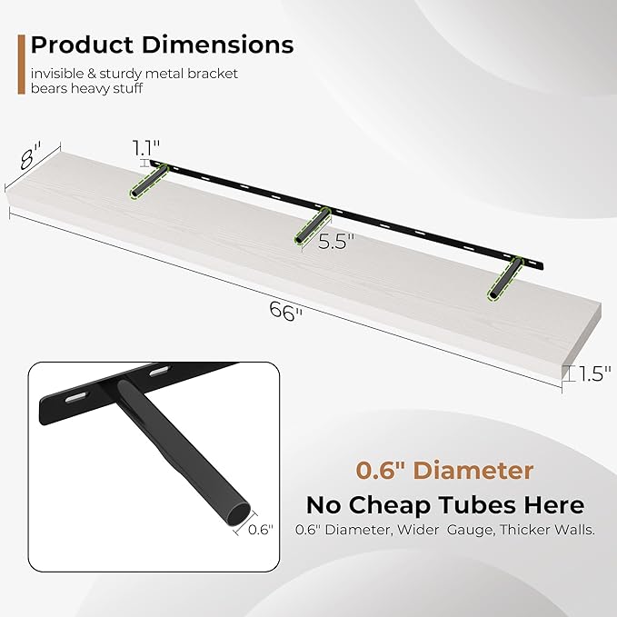 - Spacious & Heavy-Duty: 66"L x 8"D x 1.4"H: Maximize your storage with our extra-deep and thick design. Each shelf measures 55 inches long and 8 inches deep, providing ample space while supporting up to 50 lbs. This sturdy shelf saves valuable floor space, helping you reduce clutter and highlight your favorite items, even in compact areas.