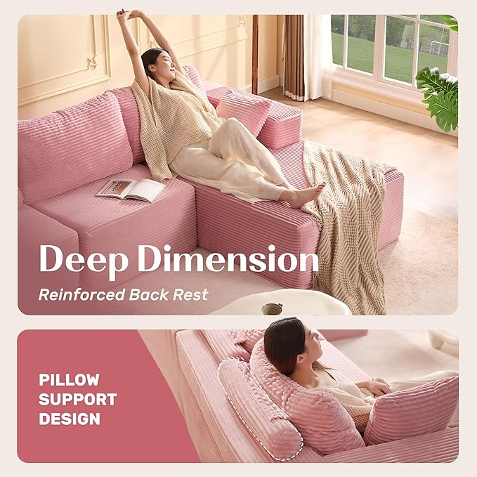 107" Boneless Couch with Deep Seat, Modular Sectional Sofa, Cloud Sectional Couch for Living Room, No Assembly Required, Corduroy, U-Shape 3 Seater Right, Pink