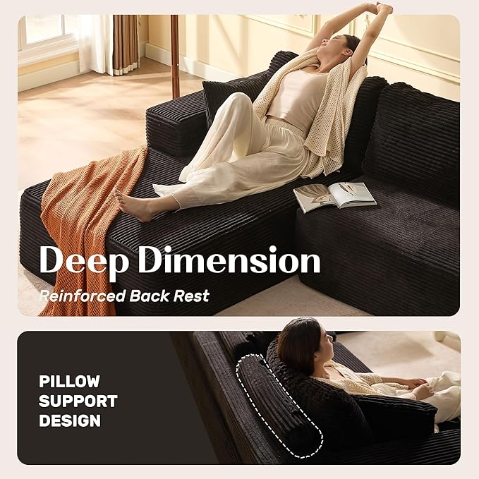 138" Boneless Couch with Deep Seat, Modular Sectional Sofa, Cloud Sectional Couch for Living Room, No Assembly Required, Corduroy, 4 Seater L-Shape Left, Black