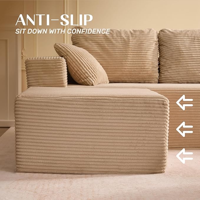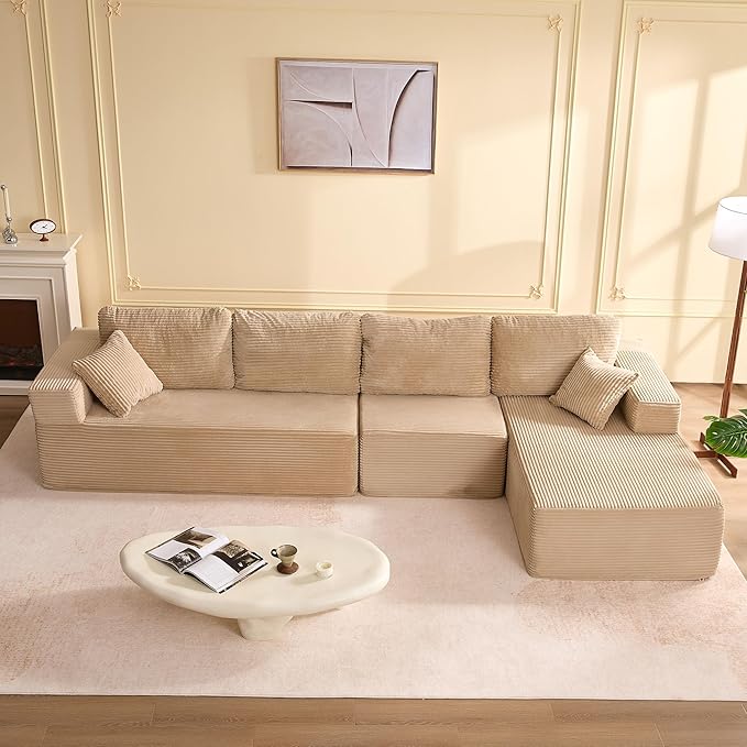 138" Boneless Couch with Deep Seat, Modular Sectional Sofa, Cloud Sectional Couch for Living Room, No Assembly Required, Corduroy, 4 Seater L-Shape Right, Camel