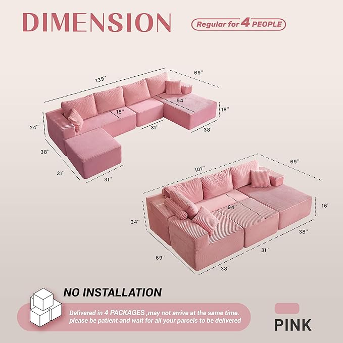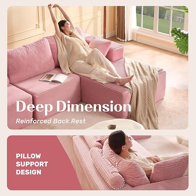 138" Boneless Couch with Deep Seat, Modular Sectional Sofa, Cloud Sectional Couch for Living Room, No Assembly Required, Corduroy, U-Shape 4 Seater Right, Pink