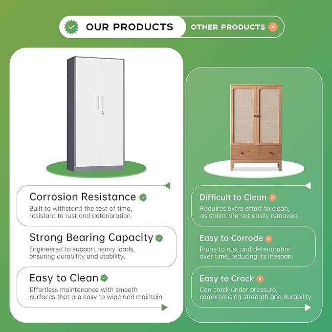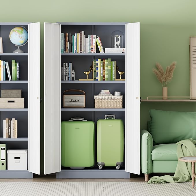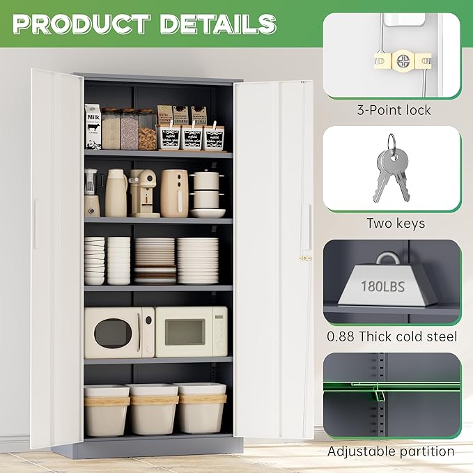 - 【Pratical design】Our tall metal cabinet equipped with 4 adjustable shelves to provide adaptability and convenience.Regardless of what your storage needs are, you have the ability to create a unique storage space to suit them.