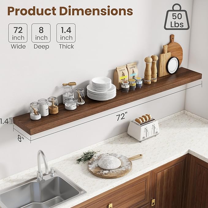 - Ample Storage Space : Our wall shelves measuring 72" L x 8" D x 1.4" H, these floating shelves offer ample space for books, decor, plants, and photo frames, providing a practical storage solution while adding style to any room.