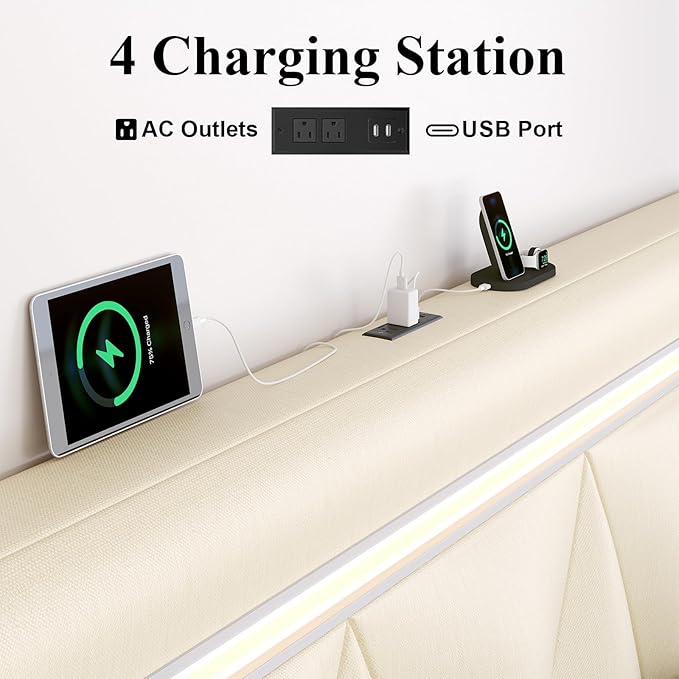 Full Size Bed Frame with LED Lights and Charging Station, Faux Leather Linen Fabric Adjustable Headboard,Modern Upholstered Bed, Sturdy Wood Slat Support, Easy Assemble, Beige